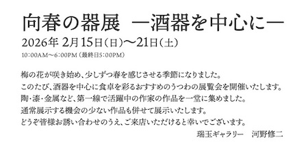 令和8年2月15日(日)~21日(土) ※3月2日(月)頃まで、作品の展示を させていただきます。会期中にお越しいただけ なかったお客様も、お気軽にご来店くださいませ。 酒器を中心に食卓を彩るおすすめの うつわの展覧会を開催いたします。 第一線で活躍中の作家の作品を集めました。 是非ご来店いただけると幸いでございます。 ※作品のご購入をご希望の方は、お気軽にお電話か メールでお問い合わせくださいませ。 メールの返信は遅くなることがございます。 03-3961-8984 suigyoku@gns-net.jp 瑞玉ギャラリートップ|展示会のご案内